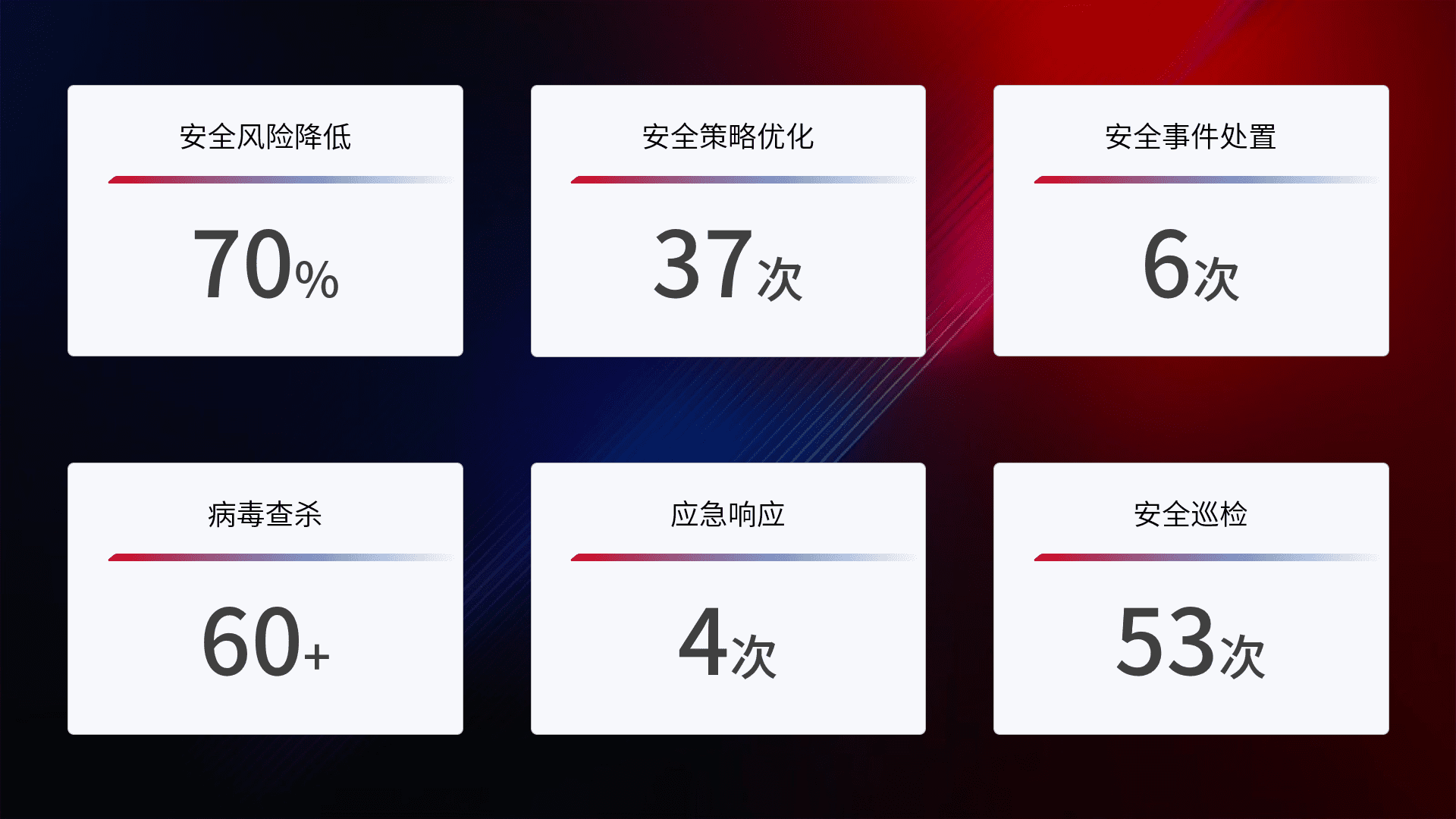 提供全面的安全事件报告体系,,,,包括处置报告、、周报、、、、季度和年度总结,,结合持续监控,,,帮助客户深入了解网络安全状况。。