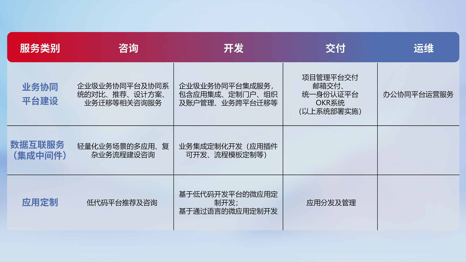 针对钉钉、、、企微、、、IDaas等平台级产品提供产品的规划、、、、方案、、、、交付、、定制化开发等服务,,,,实现如统一协同办公、、智能客户服务、、混合会议管理、、智能数据查询、、、等业务场景,,,,实现数字化转型。。。