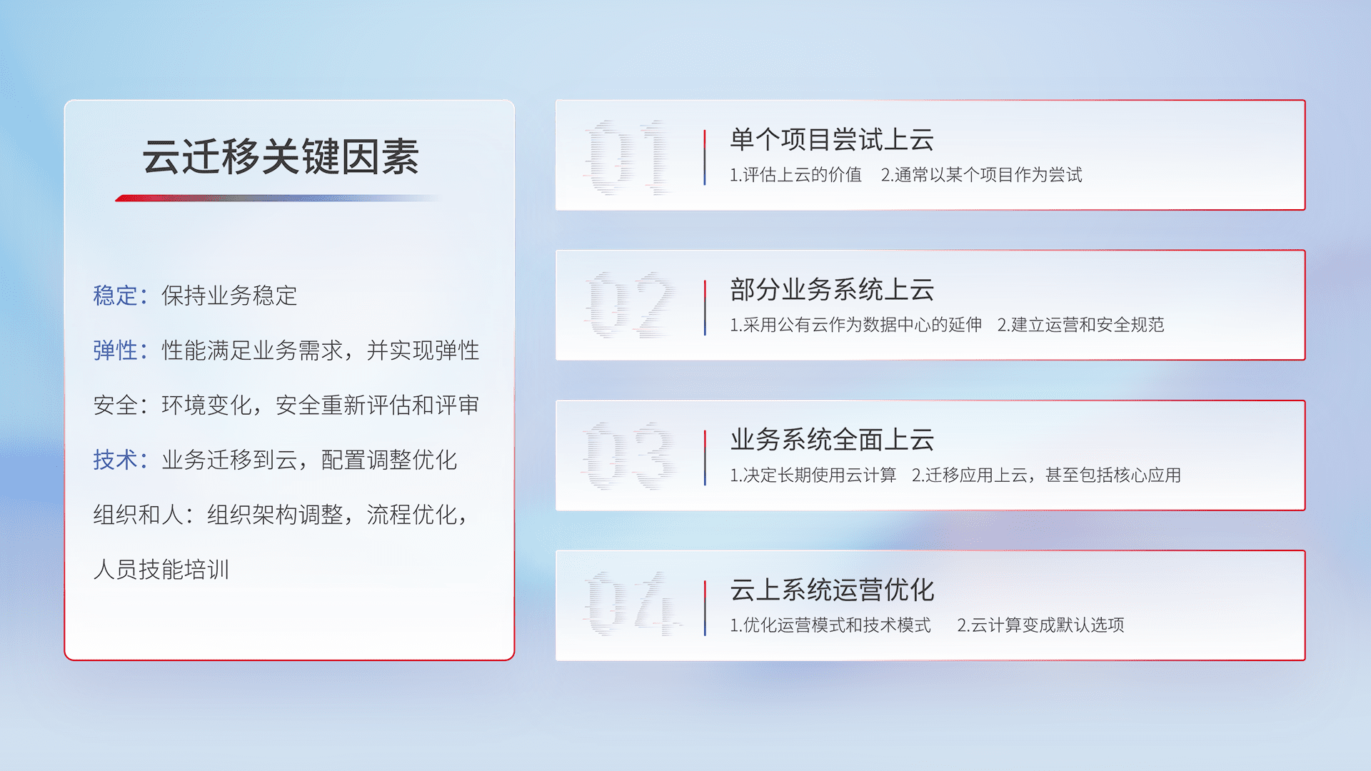 结合实际业务,,,,从规划设计、、、云平台选型、、云原生改造、、、、数据迁移、、、集成交付,,迁移全过程为客户识别最佳上云路径,,,,做好风险识别管理,,,,设计网络架构、、、、身份权限、、安全审计合规、、、操作审计、、日志审计、、、监控告警策略、、、多站点容灾设计等,,对云上基础设施进行整体规划,,,提升IT治理水平,,以满足弹性、、高可用、、、高性能的需求。。